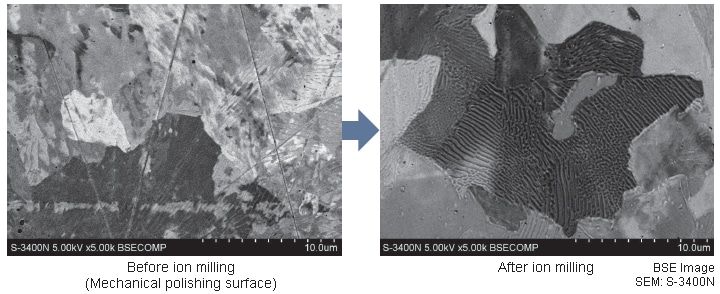The wide, polished areas can be achieved as the sample rotation (or swing) center axis is shifted from the ion beam center, thereby compensating the intensity distribution of the ion beam profile.