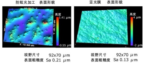 显示器用薄膜的表面作了各种加工,以保持防反射、防止指纹造成的污染等功能性。VS1800不仅针对平滑的薄膜表面,对于像亚光膜表面那样凹凸不平的样品,也能以较高的重现性进行测量。