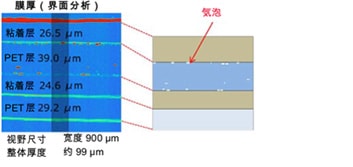 无论表面是什么材质,VS1800都能以较高的分辨率测量高度,对于如高分子材料之类透明薄膜的高差等也能进行高精度测量。 此外,关于VS1800的界面分析,对于透明材料多层层压时发生的气泡不良等现象,能以无损伤方式进行评估,因此无需制作截面,即可确认哪个层发生了异常。