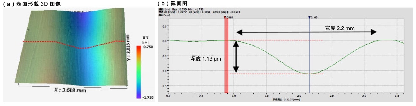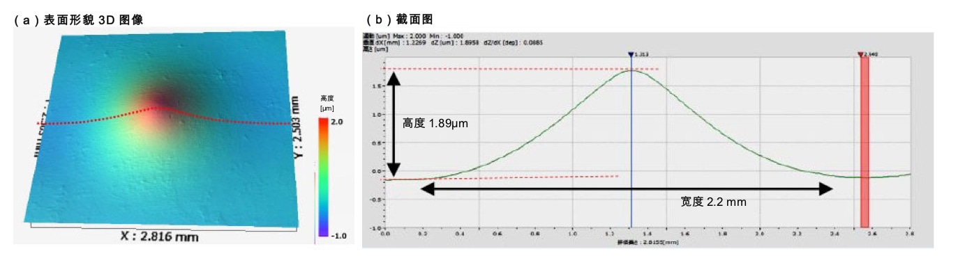 使用纳米尺度3D光学干涉测量系统VS1800进行测量,能够确认到异物混入部位呈山形隆起,并测量出其宽度及高度。(b)(c)