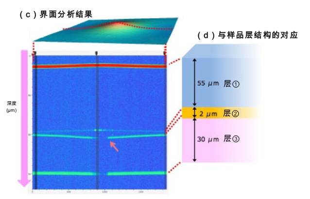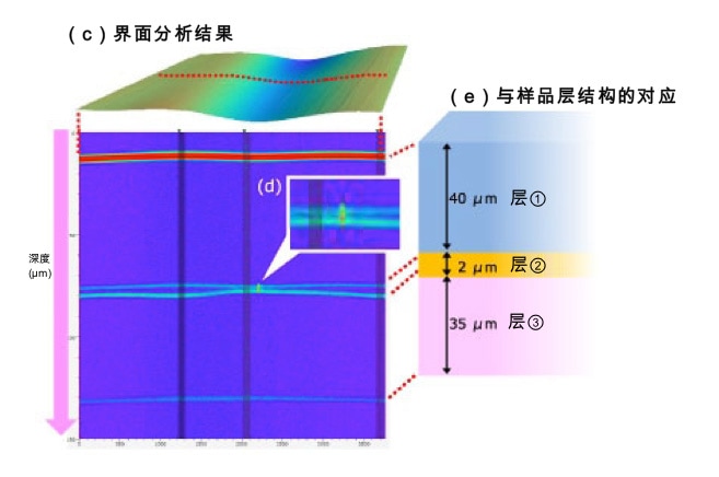 观察界面分析结果(c),可确认到与样品结构(e)一样在深度方向有4条水平线。尤其可以看到中间薄层②的厚度分布出现不均匀现象。亮点(d)为层②的不均匀部分,此处的干涉强度变化显著,可推断是气泡。