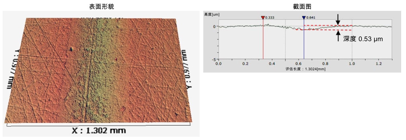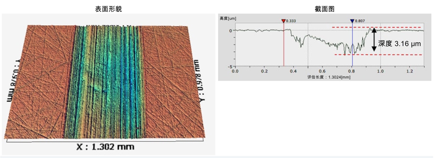图1和图2分别是使用新油和劣化油的情况下测量滑动痕形貌的结果。比较各图的滑动部位表面形貌及截面图,可以看到使用劣化油时的滑动痕深度大约是使用新油时的6倍,滑动方向上出现了明显的条纹状削痕。