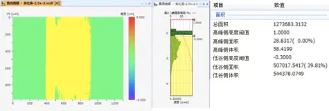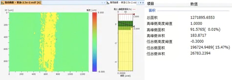 然后进行负荷曲线分析。进行分析时,针对因磨损而被削掉的区域,可使用高度阈值对等高线图像进行二值化处理,计算出面积以及体积,并可定量评估磨损量。