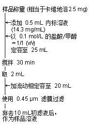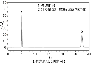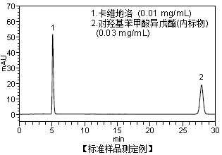 在日本药典第16版中,作为系统性能,要求卡维地洛的标准溶液和内标物的分离度达20以上;作为系统重现性,要求卡维地洛标准溶液的峰面积与内标物的峰面积比的相对标准偏差在 1.0%以下(n=6)。