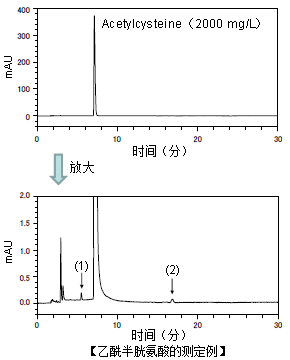 峰(1)(2)的面积值分别相当于2,000 mg/L乙酰半胱氨酸的面积值的0.03%左右。本测定例中,两个峰的S/N分别为28和13,表明测得的峰高和面积值的结果可靠。