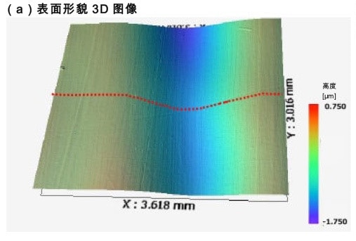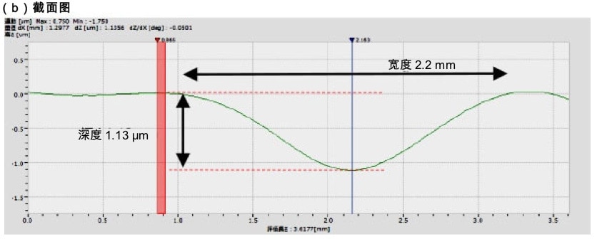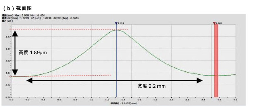 使用纳米尺度3D光学干涉测量系统VS1800进行测量,能够确认到异物混入部位呈山形隆起,并测量出其宽度及高度。(b)(c)