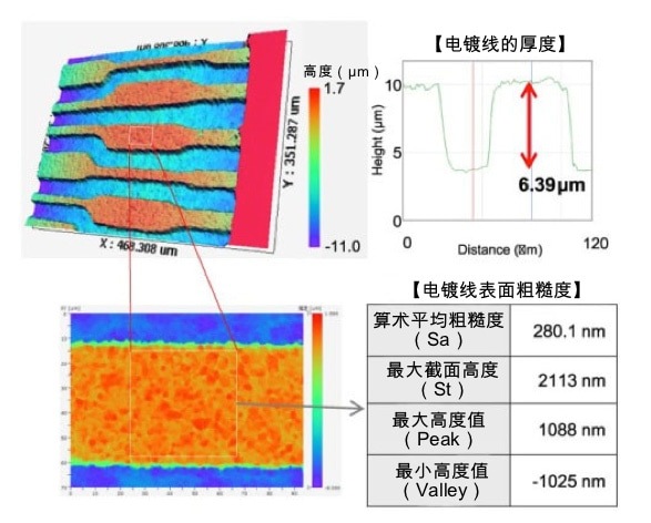 纳米尺度3D光学干涉测量系统VS1800兼具面内方向的大观察视野及高度方向的高分辨率两大特点,因此对于像电镀线之类较大的高差形状及其表面粗糙度,均可进行简单方便的测量。