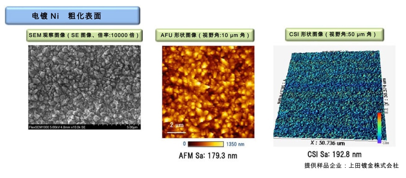 关于在电镀Ni表面施加了粗化处理的样品,使用FlexSEM 1000(SEM)以及AFM5500 M(AFM)、VS1800(纳米尺度3D光学干涉测量系统/CSI)进行观察及测量所得结果如图所示。