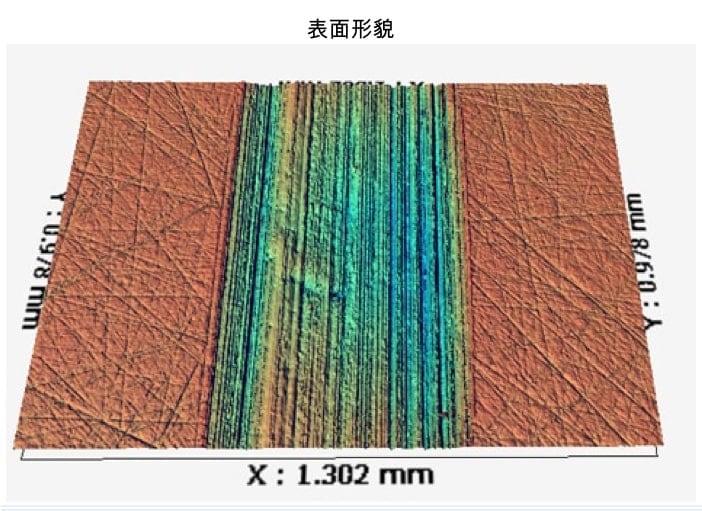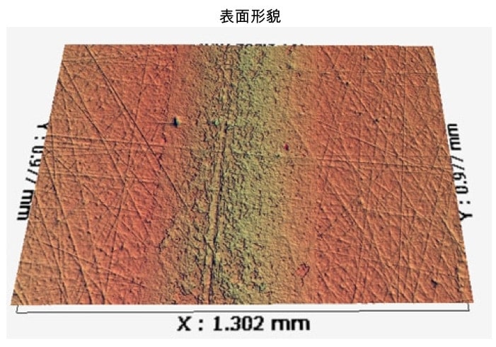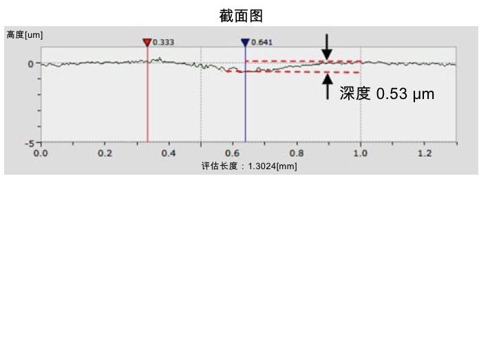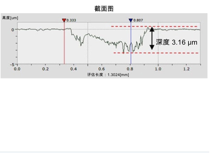 图1和图2分别是使用新油和劣化油的情况下测量滑动痕形貌的结果。比较各图的滑动部位表面形貌及截面图,可以看到使用劣化油时的滑动痕深度大约是使用新油时的6倍,滑动方向上出现了明显的条纹状削痕。