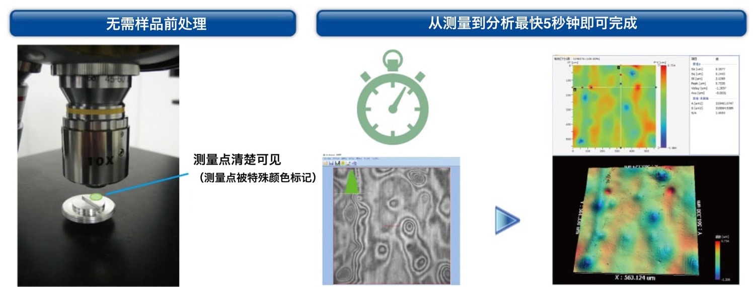 | 测量速度 | 从测量到分析最快只需5秒钟 (测量5 μm高度时) 仅扫描一个方向(Z轴)进行测量 |