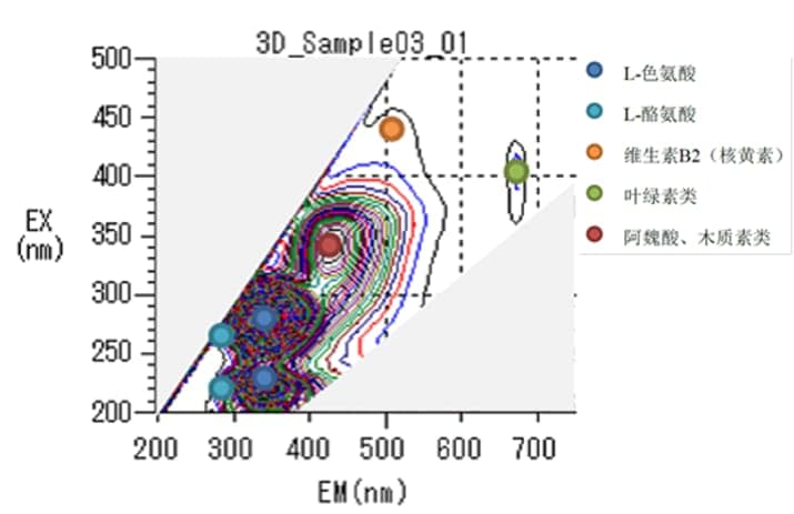 根据菠萝汁的三维荧光光谱,确定不同组份的激发和发射波长,如图所示,分别得到氨基酸、维生素、叶绿素的荧光指纹。