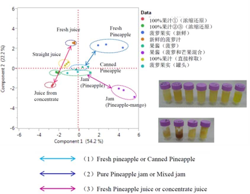 从图中可以发现,①新鲜菠萝的主成分1和主成分2为正值,罐头菠萝为原点附近的值。②完全由菠萝制成的果酱为原点附近的值,菠萝与芒果的混合果酱的主成分1为正值,主成分2为负值。③直接榨取的菠萝汁的主成分1为与原点稍微存在距离的值,主成分2为略微偏正的值。浓缩还原菠萝汁的主成分1和主成分2皆为负值。