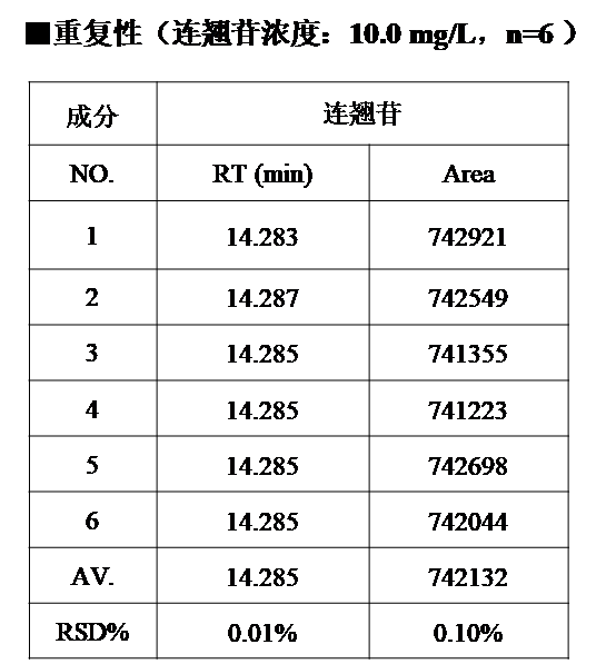 对市售的连花清瘟胶囊(颗粒)中连翘苷的含量进行了测定,测定结果符合药典的要求。并进行了样品加标回收率的测定,回收率为93.2%~105.8%。