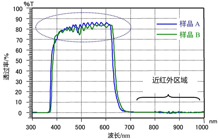 从图中可以看出,样品A和样品B在可见区的透过率在80%以上,在近红外区的透过率为0%。