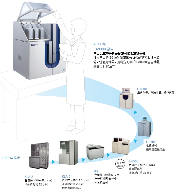 2017年推出最新型号LA8080。它在继承日立氨基酸分析仪的优异性能和数据可靠性与稳定性等优势的同时,还推出了紧凑的台式设计,解决了实验室空间不足的现实问题。