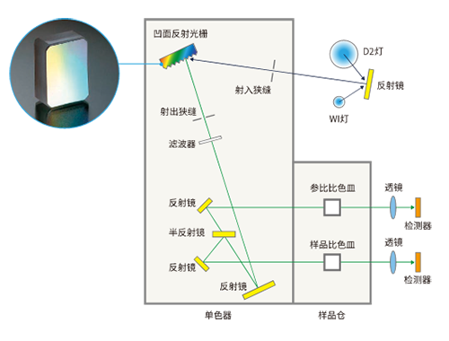 UH5200/5210采用Seya-Namioka型单色器,其内置本公司自主研发光栅光刻机制造的衍射光栅,确保了光学系统的高亮度和无像差。