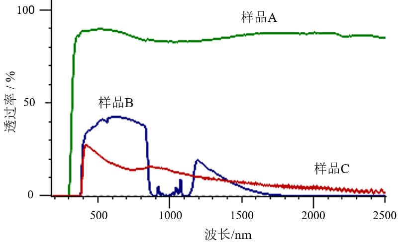 UH5700使用玻璃滤光片附件按照JIS R3106规定的计算公式,计算出可见光透过率(波长380~780 nm)和太阳光反射率(波长300~2500 nm)。