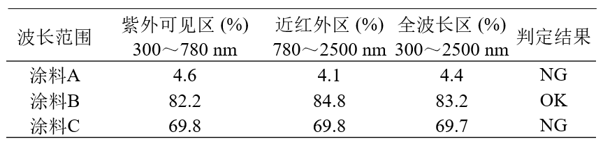 UH5700紫外分光光度计加装φ60积分球附件,根据JIS K 5675测定了3个不同的涂料样品的反射率,依据JIS K 5675,计算出太阳光反射率并判断样品特性。