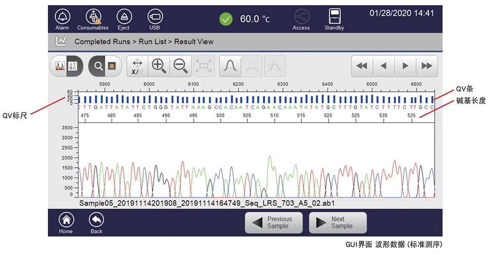 从波形数据可知,碱基对在500 bp左右,仍保持较高的分离能力和QV值。温度在15–30°C时,设备性能优异,可读取碱基长度在600 bp以上 (快速测序)或700 bp以上 (标准测序) 。