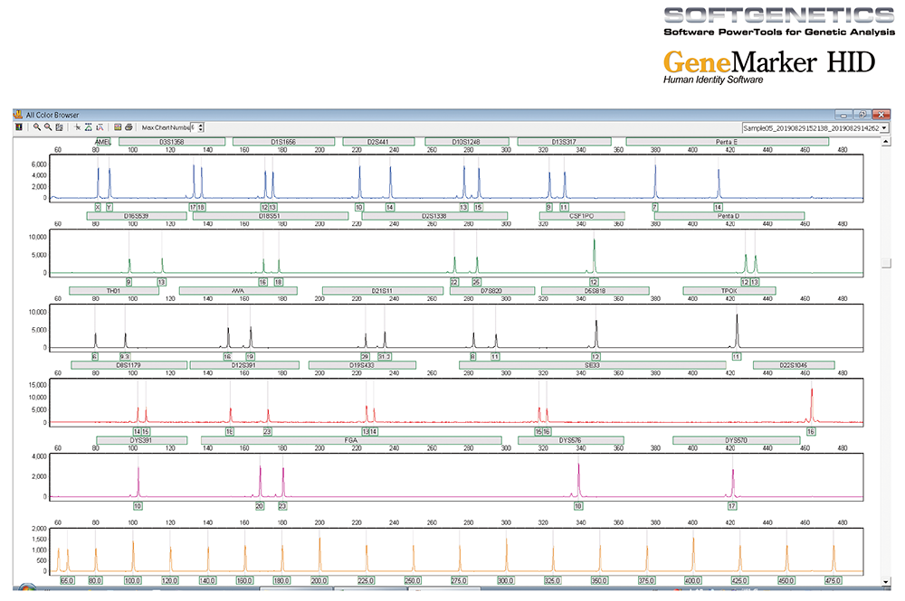 扩增200pg的2800M标准品,并使用兼容的电泳模块进行分析。通过二次解析软件GeneMarker HID,读取得到的荧光色素时间序列数据 (fsa文件) ,绘制分型图谱。