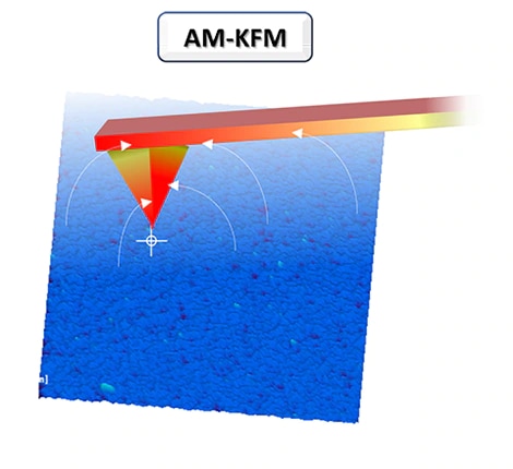 AM-KFM是检测探针与样品之间的静电,利用零点法测量表面电位。FM-KFM是先对针尖与样品之间的静电进行微分,再进行检测,同样利用零点法测量表面电位。