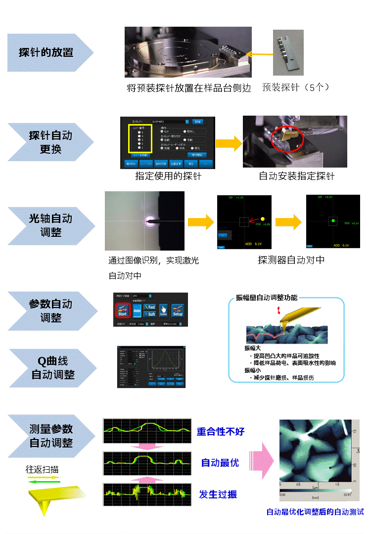 | 操作界面 | 导航功能、多窗口显示功能(测试/分析)、3D图像叠加功能、扫描可动范围/测量记录显示功能、数据批处理分析功能、探针评价功能、样品台对中功能、程序功能、故障诊断功能 | ||