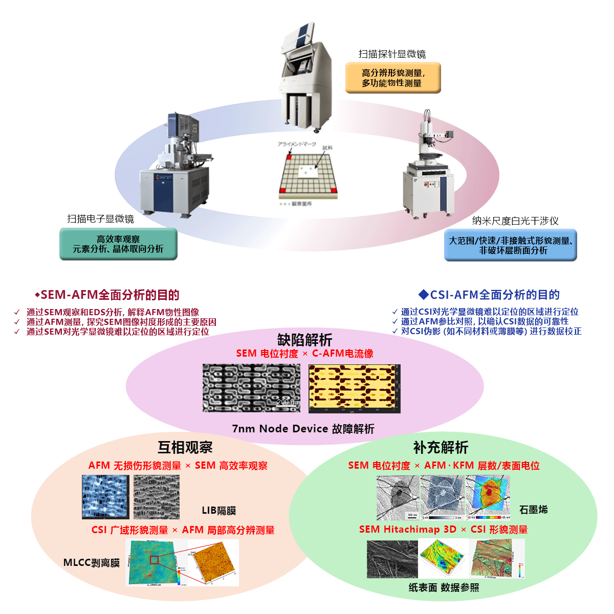 通过SEM、AFM、CSI等进行样品的同一位置测试,可以对目标视野进行多维度解析,实现数据的参照对比。日立高新可以提供特有的SEM/AFM/CSI同视野观察,实现联动分析。