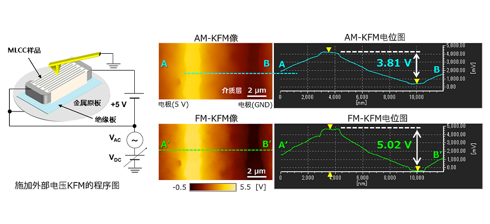 ◆AM-KFM和FM-KFM的电位图对比(样品:加载5V电压的多层陶瓷电容器横截面)