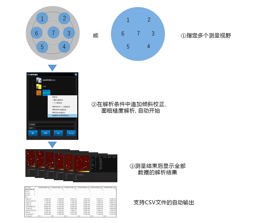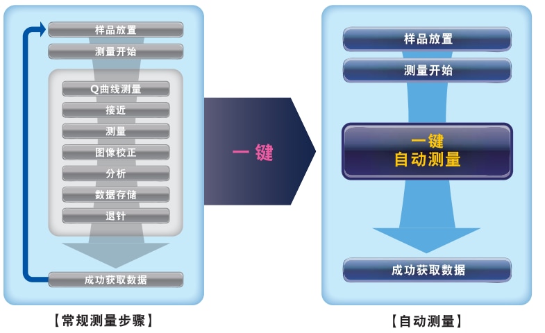 从测量到粗糙度解析的一系列操作,只需单击一次即可完成。通过自动测量功能,基于所选条件单击即可实现从自动测量到自动粗糙度解析。通过为每个样品设置程序文件,可以提高样品的测试效率,并且还支持在样品台移动范围和扫描器扫描范围内的连续自动多点测量。此外,程序文件还可以嵌入用于自动参数调整的RealTune® II 和SIS模式。通过这些功能的搭配使用,有效提升操作性,避免人为造成的数据采集误差,确保数据的可靠性。