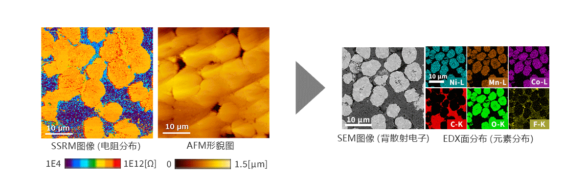 对离子研磨平滑的正极材料横截面,在SSRM模式测量电阻分布后,使用SEM-EDX对同一位置进行元素面分布观察。
