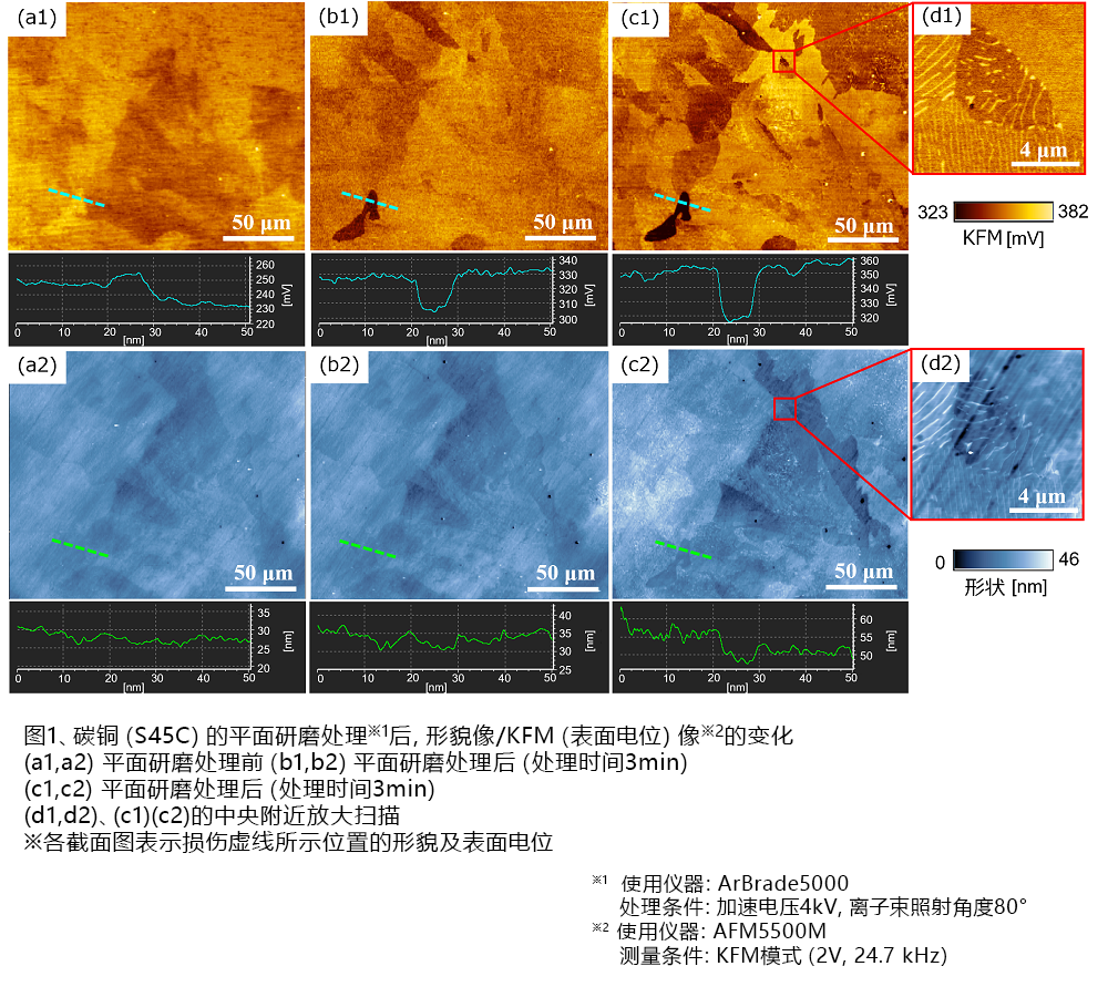图1表示平面离子研磨前后碳钢(S45C)表面的KFM图像和形貌像。从平面离子研磨处理前的形貌像(a2)可以看出,样品表面平整、干净,但KFM图像(a1)的对比度却很模糊。经过两次,每次三分钟的平面离子研磨后,KFM图像 (b1) (c1) 的对比度逐渐得到改善。此外,通过平面离子研磨,各向异性蚀刻的晶粒凹凸形貌逐渐明显(参照 (b2)(c2)),当放大局部图像时(参考 (d1)(d2)),可以清晰观察到渗碳体的层状结构。由此可以判断,平面离子研磨是提高KFM图像对比度的有效手段。