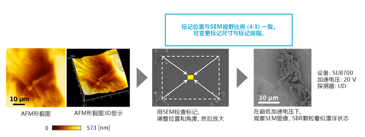 ◆使用AFM标记功能进行SEM-AFM全面分析的示例(样品:LiB电极材料上的SBR颗粒)