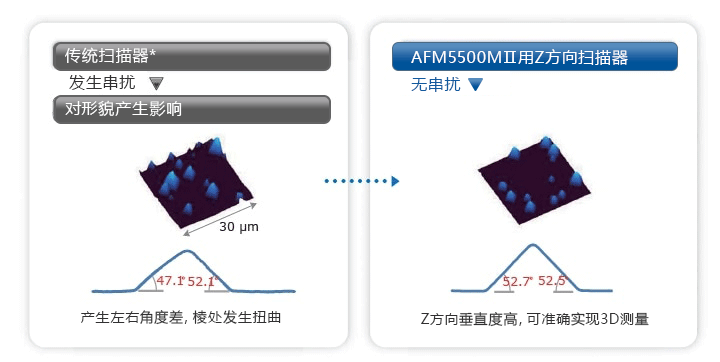 AFM5500MⅡ配置垂直方向无串扰的扫描器,抑制图像水平扭曲,使得测量结果更加准确。