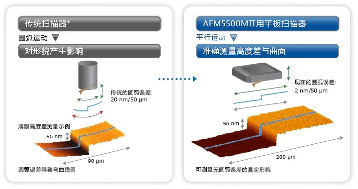 以前AFM一直使用的压电扫描管,其圆弧运动会导致数据误差,因此,通常通过软件校正方式进行平滑处理。但是,软件校正方式也不能完全消除扫描管圆弧运动的影响,仍然会出现图像扭曲。AFM5500MⅡ配置了最大200 µm扫描范围的平板扫描器,样品测试完全不受圆弧运动的影响,测试结果更加准确。