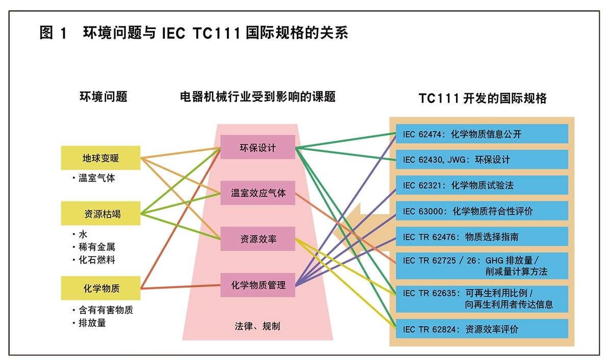 环境面临的课题多种多样, 有从影响生物和环境的有害化学物质, 有与气候变暖有关的温室效应气体、也有水和矿物资源枯竭等各种各样的课题, 对象范围也从产品扩大到系统和服务。IEC TC111 现在开发的国际规格如图1 所示。例如, 在化学物质领域, 我们构建一个框架、共通格式, 使零部件厂家将不含有害物质的声明传达到供应链, 也致力于开发规定限制物质的测量方法等的标准规格。另外, 在环保设计和温室效应气体排放量的计算方法、资源效率(可再利用性) 等各领域,也立足国际标准化活动的基本方针致力于规格开发。