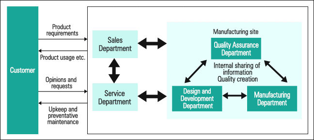 The Design and Development, Manufacturing, Quality Assurance, and Service Divisions implement activities to ensure the quality and safety of products. Using product management techniques according to individual product contributes to provide better products. Furthermore, the Sales Department and the Service Department cooperate to deliver customers’ feedbacks to manufacturing sites, so that we ensure to generate quality as a unified company.