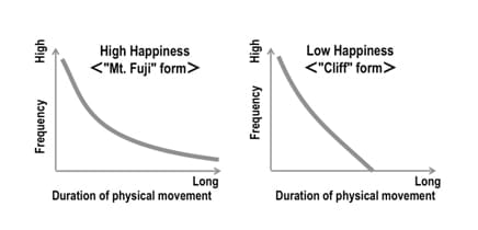 (1) Identifying distinctive patterns in physical movements linked to the collective happiness Hitachi has been involved in research and development targeting technologies for objectively measuring human behaviors since 2004. Recently, it developed a method for monitoring the status of organizations and finding ways of improving a company’s business performance by analyzing huge volumes of human behavior data obtained using wearable sensors ("Business Microscopes") in the form of name tags, which are equipped with acceleration sensors and face-to-face sensors(6). Recently, Hitachi used these wearable sensors to gather acceleration data that illustrates some 5 billion points of physical movement for 468 employees working in ten organizations in seven companies (a total of 5,000 man-days), and analyzed correlations with data that indicates the group's "happiness level". Looking at the acceleration data, it focused on duration of physical movements, and investigated correlations with the group's "happiness level". The group "happiness level" uses data calculated based on the Center for Epidemiologic Studies Depression Scale (CES-D)(7), a self-evaluation scale for depressive tendencies that was developed by the National Institute of Mental Health, and which is used extensively throughout the world. By tabulating data for individual groups (organizations) and examining the relationships with frequency distributions for the duration of physical movements in those groups, it became clear that in groups with a high level of happiness, the frequency distribution for maintenance time was illustrated by a gentle curve with a long, extended'skirt" (much like the shape of Mt. Fuji), while in the case of groups with a low level of happiness, the line was much straighter, dropping sharply like a cliff.