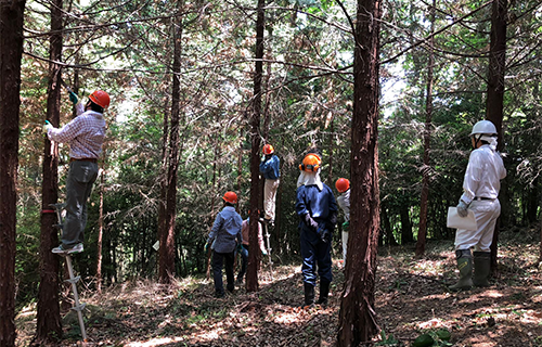 On the one hand, we contribute to environmental conservation through our regular business, on the other we promote activities for global environmental conservation activities, such as the conservation of ecosystems in the local area through various activities by companies, as well as employees and their families. As part of these efforts, Hitachi High-Tech rented an approximately 2.3-hectare national forest in Ishioka City, Ibaraki from the government under the Forestry Agency’s Corporate Forest Program. The company named the forest the Hitachi High-Tech Yasato Forest, and has been working on a 60-year program of silviculture activities since 2005. New employees as well as interested employees and their families participate in work such as weeding and pruning to facilitate the growth of trees. Going forward, the company will continue to develop the forest until young trees are fully grown and cut down, thereby contributing to the conservation of the global environment and the prevention of global warming.
