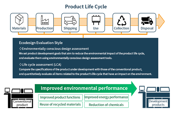 In Life Cycle Assessment (LCA), we quantitatively evaluate the major factors of global environmental impacts such as metal and plastic consumption, water consumption, climate change, and air pollution for newly developed products, and use the results to disclose information to stakeholders and to improve the design of next-generation products.