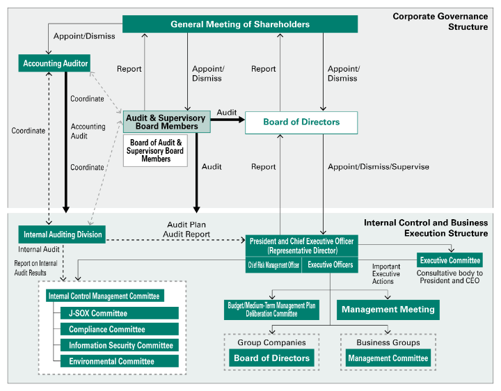 The Board of Directors makes decisions on matters stipulated by laws and regulations, such as the selection of representative directors, as well as important management matters, and supervises execution of business. While ensuring the appropriateness and speed of business execution by delegating authority to executive officers as necessary, important matters are discussed and approved by the Executive Committee, which is an advisory body to the President and CEO, before being decided by the President and CEO. This ensures that decisions are made appropriately through active discussions and mutual checks and balances among executive officers with diverse backgrounds. The corporate auditors are appointed as the supervisory body, and the corporate auditors’ council has been established as an optional coordinating body for each corporate auditor to communicate, exchange opinions, share information, and decide common matters. Corporate auditors oversee the execution of company operations in cooperation with the Internal Audit Department, such as the Internal Auditing Division, and the accounting auditors as necessary.