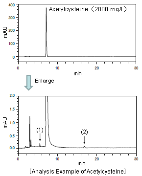 Each of the very small peaks, (1) and (2), has an area equivalent to about 0.03% of the area of acetylcysteine (2,000 mg/L). In this example, the S/N of these peaks are respectively 28 and 13, indicating that sufficiently reliable peak heights and areas are obtained.