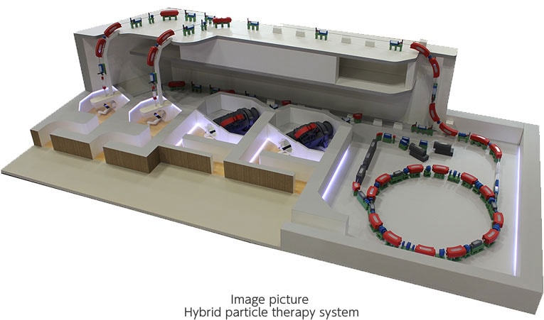 Hitachi provides a Hybrid particle therapy system which can irradiate both proton and carbon-ion from one accelerator.