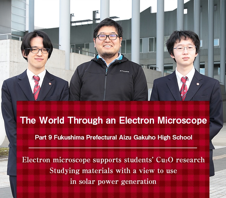 We spoke with two of the students involved in this research project, Taku Nakagawa and Kazuhide Demura of the SSH Inquiry Club chemistry group, along with the teacher and advisor of the SSH Inquiry Club, Kentarou Ohashi, about their research activities and the role of electron microscopes in the project.