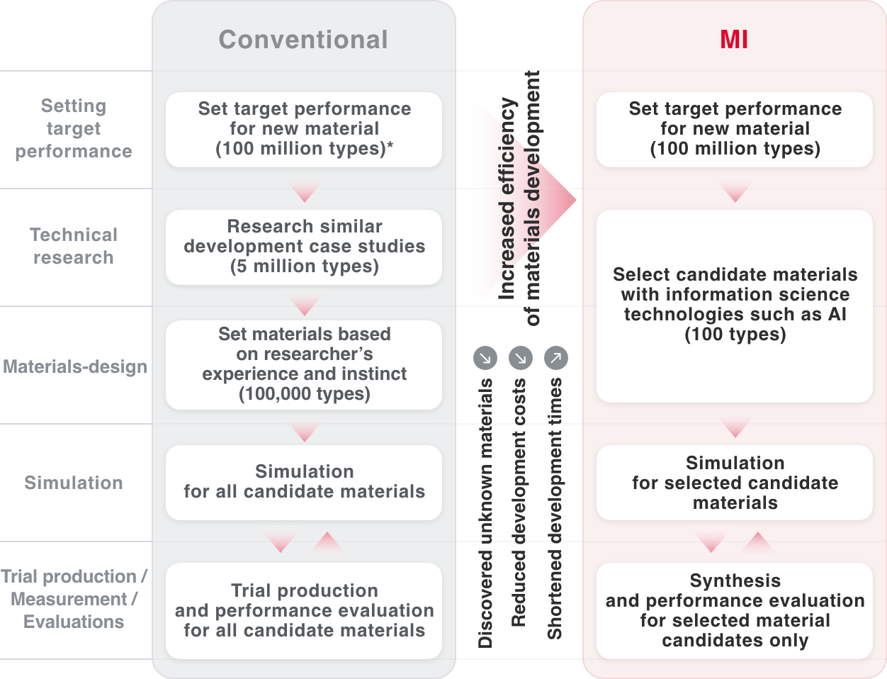 - Compound Discovery AI is utilized to dramatically transform the process of developing materials. The selection of candidate compounds and length of simulation cycles are shortened to 1/60 of their original duration. The number of prototype iterations and volume of material waste from experiments are reduced to one-fifth.