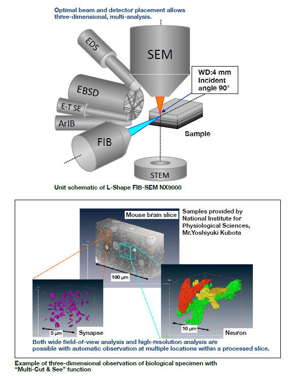 The NX9000 is a processing and observation system for three-dimensional analysis, with an FIB and SEM arranged perpendicular to each other. Optimal positioning of the FIB-SEM columns and detection systems allows high-resolution, three-dimensional, multi-analysis