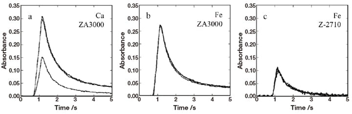 Figure 1 shows absorbance profiles for boron (80 ng) acquired with a ZA3000 and a Z-2710 using Fe modifiers. For comparison we also show an absorbance profile acquired with a ZA3000 using Ca modifiers, which were used in previously reported studies. With Ca modifiers, the maximum absorbance is 0.30—a high value—but the relative standard deviation (RSD) is 0.349, indicating poor reproducibility. With Fe modifiers, the maximum absorbance is 0.27, lower than for Ca, but the RSD is 0.0368, indicating higher reproducibility than Ca. In previous reports, Ca modifiers were used together with coating agents6-8), and the poor reproducibility may be attributed to the fact that no coating treatment was applied. In contrast, Fe modifiers yield high reproducibility and adequate absorbance without coating treatment. Coating treatments are time-consuming and cumbersome and decrease in efficacy as the number of measurements increases. Thus, the use of Fe modifiers, which allow stable measurements to be made without coating treatments, can be considered more appropriate for measurement of element quantities. The maximum absorbance measured by the Z-2710 is lower than that measured by the ZA3000. This is because the extent of atomization temperature overshoot at the optical temperature control cutoff is relatively small9). High atomization temperatures are effective for atomization of boron. The detection threshold for measurements of boron with the Z-2710 using Fe modifiers was 2.6 µg L-1 9). This represents an order-of-magnitude improvement over previous reports, demonstrating the usefulness of Fe for measurements of boron volumes via GFAAS.