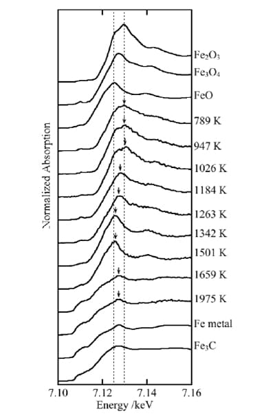Figure 3 shows XANES spectra for Fe modifiers inside the graphite furnace at the conclusion of the pyrolysis stage for various pyrolysis temperatures between 789 and 1975 K. Spectra for some reference materials are also shown for comparison. Ordinarily, oxidizing chemical species exhibit peaks at higher energies, while reducing chemical species exhibit peaks at lower energies. A comparison to spectra for reference materials shows that, for pyrolysis temperatures of 1026 K and below, Fe inside the graphite furnace exhibits a peak at the same locations as 3-valent Fe2O3; another similarity is the appearance of a shoulder-like feature at lower energies. At 1184 K and 1263 K the peak energy shifts slightly downward—closer to that of Fe3O4—indicating partial reduction of Fe. At 1342 K and 1501 K the peak energy is close to that of FeO. At 1659 K and 1975 K the peak shift slightly upward and a prominent low-energy shoulder appears, resembling the spectrum of metallic Fe.