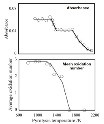 Figure 4 shows, for each pyrolysis temperature, the absorbance of boron as determined from pyrolysis curves and the mean oxidation number of Fe modifiers obtained from XANES spectra. As the temperature rises, the absorbance first exhibits a plateau over the interval 900–1300 K, then decreases and plateaus at a lower value between 1400–1750 K, after which it decreases monotonically. The mean oxidation number of Fe remains high for pyrolysis temperatures below 1026 K, as Fe2O3 and Fe3O4 are the dominant chemical species in this regime. It decreases gradually over the range 1026–1501 K—in which FeO is the dominant species—then drops sharply between 1501 and 1659 K, falling to a mean oxidation number of 0 beyond 1659 K as metallic Fe is the dominant species in this regime. The temperature dependences of the two quantities are roughly consistent, indicating that the chemical state of Fe modifiers affects the absorbance of boron. As Fe oxides with high oxidation numbers yield high absorbance, we conclude that low pyrolysis temperatures are optimal for quantifying the presence of boron.