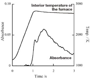 Under conditions such that the temperature increase during the atomization stage takes place at a constant rate, we can analyze the absolute temperature of the furnace walls and the absorbance profiles on the basis of kinetic theory; this analysis allows us to determine the activation energy Ea of the reaction that produces atomic vapor and the standard change in enthalpy ΔH associated with this phase transition12),14). For Pb and Au, kinetic-theory analyses based on solid-state reaction kinetics have been reported previously15)-18). However, the high atomization temperature of boron makes it difficult to obtain absorbance profiles for processes involving constant-rate temperature increases.