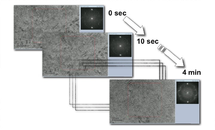 Figure 1 depicts the observed states of an actual perovskite PVC imaged by a Hitachi HF-3300 field-emission transmission electron microscope (FE-TEM). In the image captured 10 seconds after the start of the observation, the electron-beam diffraction image appears unchanged; however, after 4 minutes the electron-beam diffraction image has evolved from a spot to a hollow ring, and there are indications of the emergence of non-crystalline matter. We attribute both of these effects to radiolysis or knock-on.